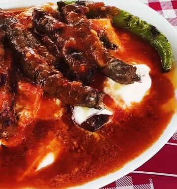 170 gr. Ödemiş Köfte, Özel İskender Sos, Yoğurt, Tereyağlı Pide, Közlenmiş Domates, Közlenmiş Biber